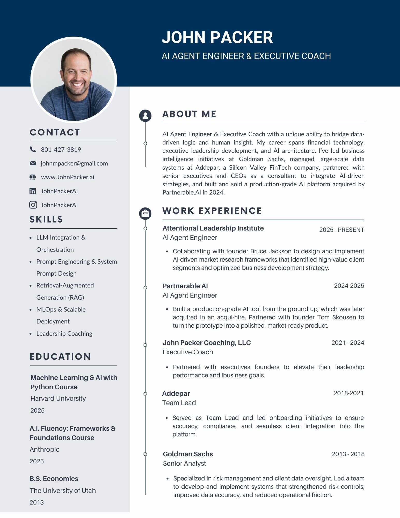 AI Agent Engineer & Executive Coach with a unique ability to bridge data-driven logic and human insight. My career spans financial technology, executive leadership development, and AI architecture. I’ve led business intelligence initiatives at Goldman Sachs, managed large-scale data systems at Addepar, a Silicon Valley FinTech company, partnered with senior executives and CEOs as a consultant to integrate AI-driven strategies, and built and sold a production-grade AI platform acquired by Partnerable.AI in 2024.
